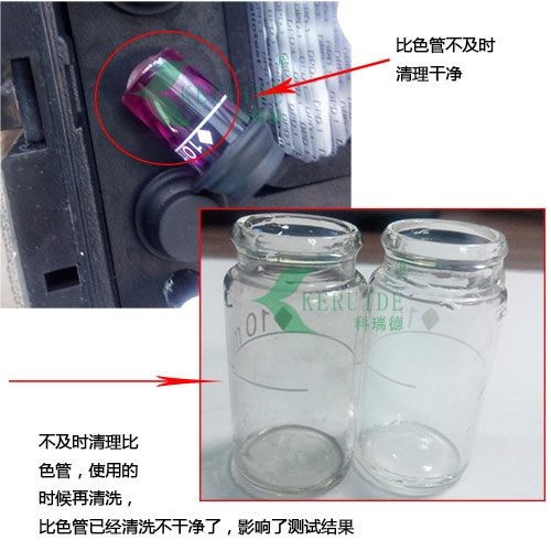 由圖可以看出比色管的維護對于今后使用的準確度很重要。比色管壁上或測量室內壁上的劃痕、指印或水珠都會造成不準確的測試結果。保持比色管和測量室的干燥和清潔也是很重要的,其中玻璃材質需要保持干凈無瑕疵,劃痕和劃傷會永久影響讀數的準確度。所以比色管可以定期采用酸洗。