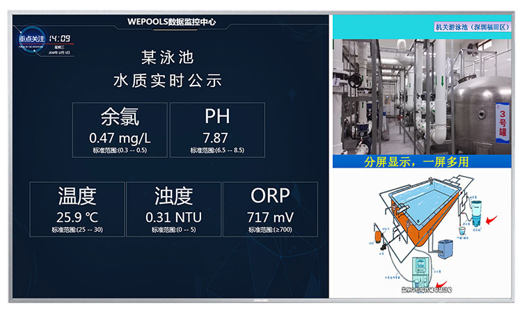水質實時公示屏的設計理念是為解決目前泳池手寫水質數據公示的落后方式而研發的。目前大部份泳池都是以手寫水質數據來進行公示的,這個公示形同虛設,根本沒起到相應的作用。我們的水質實時公示屏是將水質在線監測儀檢測到泳池的實時數據直接通過本屏進行公示,其數據是實時、動態及真實的。并且本屏還能通過分屏設置,給公眾展示游泳場館的各類設施及宣傳,達到一屏多用的效果。