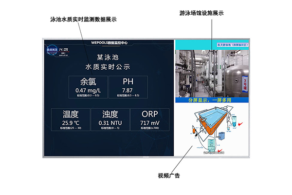 衛普士水質公示屏主要是將水質在線監測儀檢測到泳池的實時數據直接通過本屏進行公示,其數據是實時、動態及真實的,并且能一屏多用。