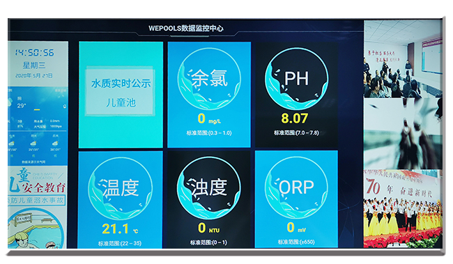 ????公示屏:水質實時公示屏,在線監測儀能連接到公示屏上,市民可以實時查看泳池溫度、pH、余氯等指標,公示屏有壁掛式和立式兩種,一般放在泳池旁或收銀大廳都可以。