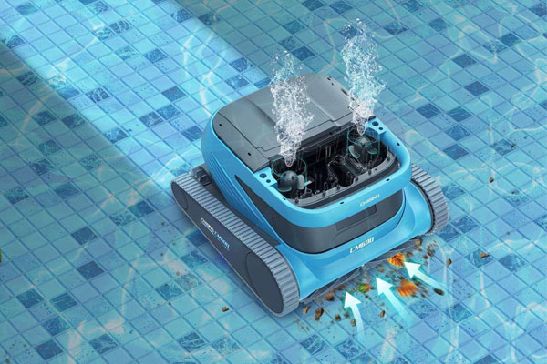4、雙重主動刷:機器內置雙重吸水泵雙倍吸力,并且主動刷移動與清洗可以同步進行,主動刷以相對履帶更高的轉速產生強勁的摩擦力,減少池底沉積物揚起,讓污漬無處可逃。
