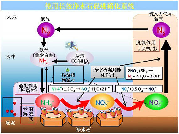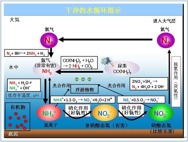 干凈的水質:大氣中的氨氣和水中的尿素變換成氨氣。氨氣為有害的東西,極易溶于水中,變換成氨氣離子。(溫度,PH高的話就變回氨氣)此氨氣離子將被硝化,由亞硝酸變更為硝酸(比較無害的氣體)。如果硝酸急速增加的話也會使PH增加。最后,硝酸由厭氧性脫氮后變成氮氣氣體揮發入大氣層中。