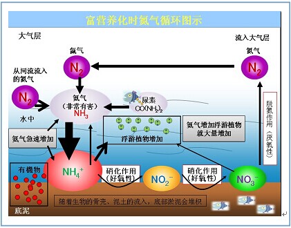 富營養化水質:如果氮氣循環不順水質就會惡化。水中的氨氣增加后,導致氨氣急速增加。這個結果導致,以氨氣為光合作用為基礎的浮游植物會大量增加,魚類漸漸死亡,導致水質惡化。另外,隨著生物骨殼、泥土流入,水底的淤泥會堆積。導致厭氧層增加,好氧層減少,水質臭味變濃。