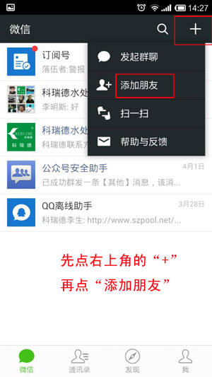 1,在微信頁面右上角點擊“+”,然后點擊“添加朋友”;