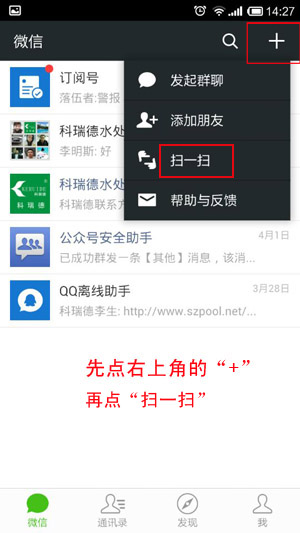 1,點擊右上角的“+”,然后點“掃一掃”;