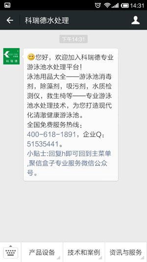 7,此時,你已經成功關注“科瑞德水處理”的微信公眾號了,以后公眾號發信息,你就可以再第一時間收到,諸如此類信息: