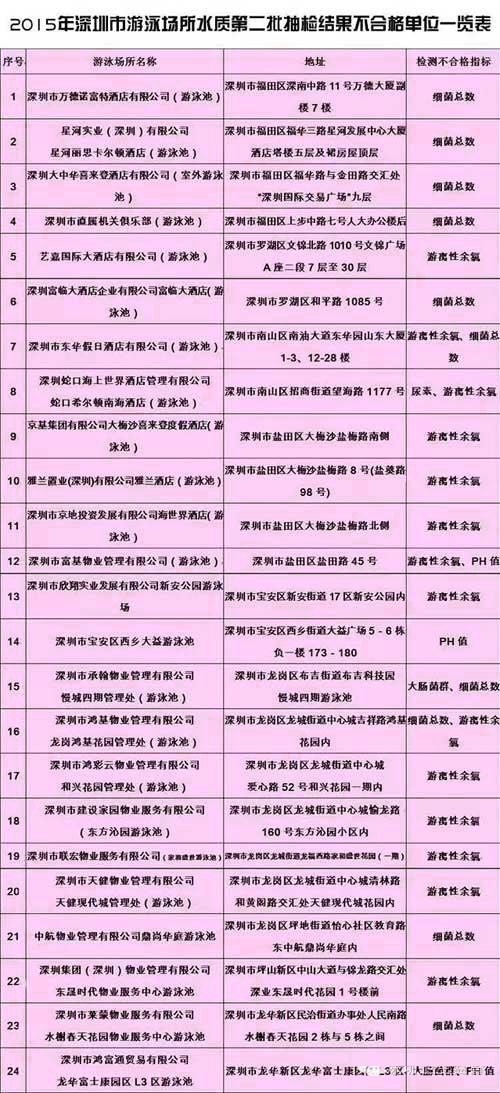 2015年深圳游泳池水質抽檢由深圳市衛計委組織進行,該委近期組織市、區衛生監督機構對全市游泳場所水質進行了抽樣檢驗,共抽檢游泳場所224家,結果顯示24家不合格。