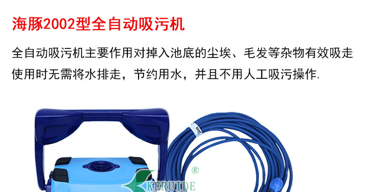 全自動吸污機也叫游泳池全自動吸污機,主要用于游泳池的池底吸塵,屬于泳池清潔設備的一種。本產品為美國進口,配20米線,帶遙控,可編程??筛鶕斡境氐拇笮≡O定不同的模式,靈活方便。海豚全自動吸污機的優點是:吸污時無需要將水排走,節約用水,同時無需工作人員在場,設定自動清潔池底及池壁。
