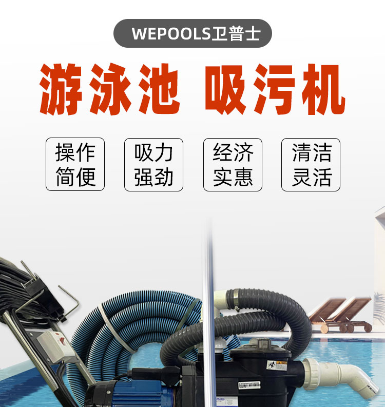 游泳池吸污機主要用于游泳池池底吸塵,本型號為:衛普士吸污機3012型,使用時主機放在岸邊,吸污管及吸污頭用伸縮桿伸入水底進行吸塵,所以也叫岸基型游泳池吸污機。