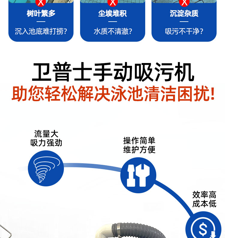 為什么推薦選擇我們的衛普士3012手動吸污機?衛普士3012游泳池手動吸污機配備19寸加重加厚吸污頭,避免吸污上浮,讓您站在岸邊就能輕松吸污!