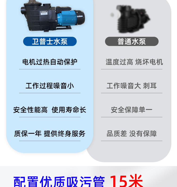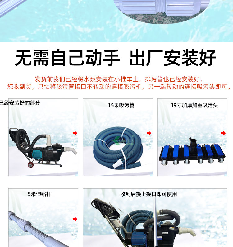 除了配備的吸污頭及電纜線優于與市場上大部分手動吸污機,本款吸污機的吸污管也同樣配備的是優質雙色雙層自浮加厚吸污管,10米一節,一個吸污機配備3節吸污管共30米長。此吸污管耐磨、耐壓、硬度高、不易變形,性價比高。便于大家收到貨后使用以及運輸安全,本款吸污泵在發貨前我們就已將水泵安裝專用的小車上,排污管也已裝在吸污泵上,各位收到貨后,按照以下圖片指示安裝即可使用。