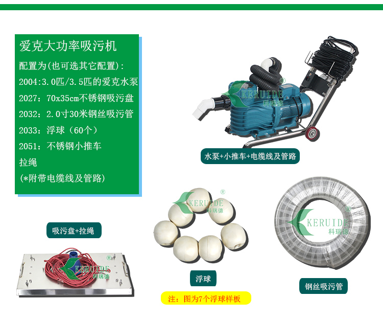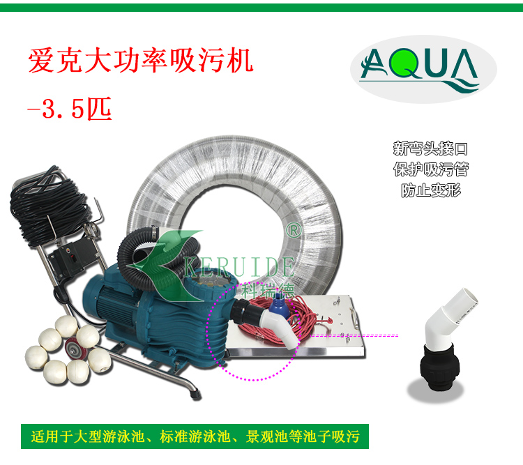 本產品為愛克游泳池手動吸污機,在使用沉淀劑8小時之后進行手動吸污。吸污泵的功率為3.5匹,意大利愛克品牌,屬于大功率游泳池吸污機,吸污干凈,快速。適用于各種大型游泳池、標準泳池、水上樂園、景觀池、水工業等。
